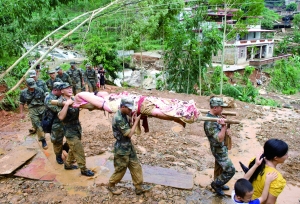 9月16日,在福建南安九都鎮林坑村,救援部隊官兵抬出搜救到的傷者。新華社發