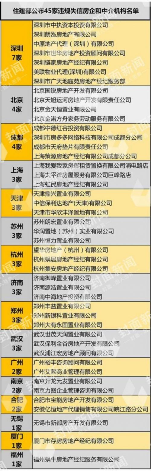 記者梳理發現,剩余的7個城市分別是——上海、廣州、深圳、南京、福州、廈門、杭州。其中,上海和廣州都是我國三大一線城市;深圳,則是住建部此次通報的違規失信企業和機構最多的城市,共7家,包括鏈家、中原地產等知名“中介”。