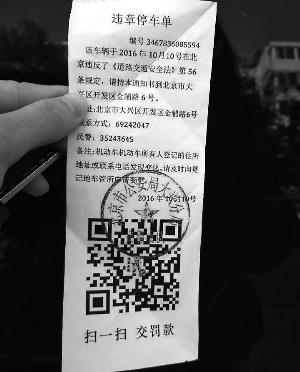 北京晨報記者用手機掃了“罰單”下附著的二維碼,跳轉進一個轉賬頁面,對方頭像是一名交警騎著摩托車的卡通形象,旁邊寫著“違章辦理”的幾個大紅字,而付錢說明則填寫著“北京市大興區交通支隊”。