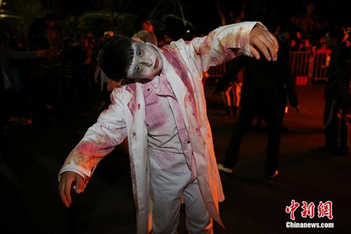 資料圖:在萬(wàn)圣節(jié)來(lái)臨之際,一場(chǎng)真實(shí)版《釜山行》和《生化危機(jī)》在常州嬉戲谷上演,年輕人打扮成影片中的角色巡游街道,恐怖而夸張的造型吸引了不少目光。唐娟 攝