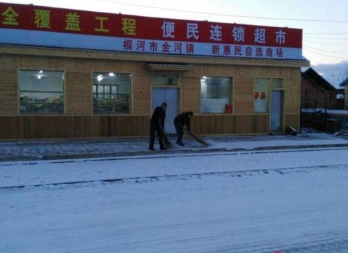 11月3日,根河市金河鎮(zhèn)的居民在掃門前雪。