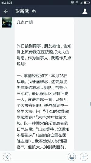 爆料者稱患者彭某為中國人民大學哲學院教授彭新武,記者從學校哲學院官網(wǎng)上確實看到其資料。昨日,記者電話聯(lián)系到彭教授,他坦言自己確在看病期間與一位男“醫(yī)生”有過爭執(zhí),但網(wǎng)傳“教授打人”并不屬實。他回憶稱,上周六早晨牙疼難忍,就到家附近的北京老年醫(yī)院就診,“早晨7點就到了,排隊、掛號,等了將近三個小時還沒輪到我……”