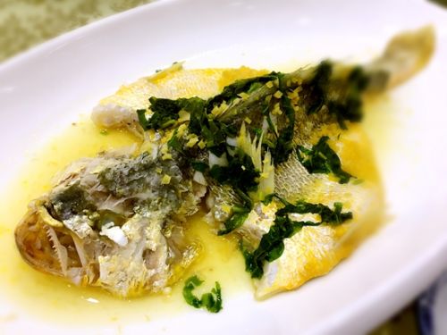 雪菜蒸黃魚,金黃色黃魚配綠色雪菜清蒸而成,肉嫰、味鮮、清香入脾!