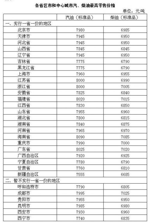 附:各省區市和中心城市汽、柴油最高零售價格(據國家發改委)