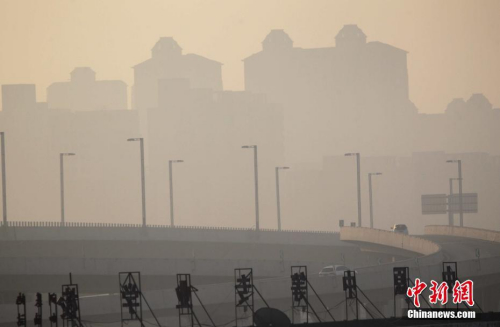 12月16日,霧霾籠罩下的河南鄭州城區。中新社記者 王中舉 攝
