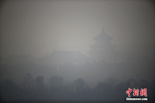 12月17日,北京天壇祈年殿在霧霾籠罩下若隱若現。自12月16日20時至21日24時,北京啟動空氣重污染紅色預警。中新社記者 富田 攝