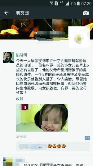 昨天早上,深圳市政協(xié)委員、原市眼科醫(yī)院角膜及眼表病區(qū)主任、眼庫執(zhí)行主任姚曉明通過微信首先發(fā)布消息稱,羅一笑在24日早上6點(diǎn)離開人世,她的父母希望捐獻(xiàn)她的遺體和器官。