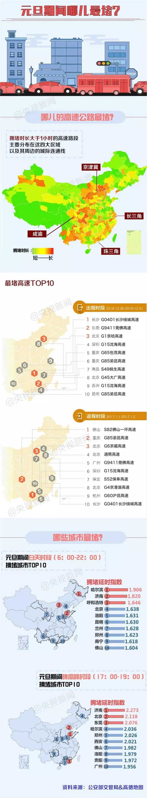大數據來了!元旦期間全國最堵城市預測出爐 2016-12-28 16:11 array(1) { [47425]=> array(3) { [2]=> array(3) { [0]=> string(6) "元旦" [1]=> string(9) "大數據" [2]=> string(12) "出行情況" } [1]=> array(1) { [0]=> string(6) "張雪" } [4]=> array(1) { [0]=> string(18) "山東高速交警" } } } 山東高速交警 張雪 0 近日,在公安部交通管理局指導下,全國多地交警部門利用大數據預測了元旦節假日期間出行情況。元旦假期,哪些地方最堵?什么時候最堵?一圖了解。 元旦出行啥時候最堵? 元旦期間哪的高速最堵? 元旦期間哪些城市最堵? 今年11月發布的2016年第三季度中國主要城市交通分析報告顯示,在“中國堵城排行榜”上,哈爾濱取代第二季度排名第一的北京,成為全國最堵城市,濟南成為第二堵城市,青島列第十名。 你是準備逃離這座擁堵的城市,去外面的世界“擠油油”呢?還是選擇“家里蹲”呢?快來評論區留言告訴我們吧!