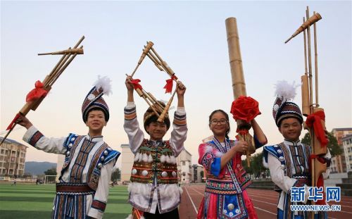 12月30日,在廣西融水苗族自治縣民族中學,學校蘆笙隊隊員用樂器擺出“2017”字樣,喜迎新年。