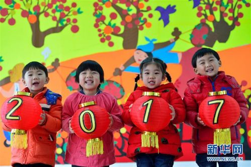 12月30日,湖北省保康縣直機關幼兒園的小朋友手拿印有“2017”字樣的紅燈籠合影,迎接新年的到來。