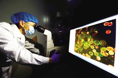 圖為科技人員在觀察免疫熒光檢測寨卡病毒感染細胞。