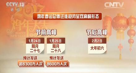 中國各地的火車站、長途客運站以及飛機場等,在巔峰時刻成為世界上人口最密集的地方之一。雞年春運總體遷徙趨勢呈雙高峰形態,1月24日(臘月二十七)、25日(臘月二十八)為節前高峰,而2月2日(大年初六)則為節后遷徙高峰;預計24號發送旅客總量超8300萬人次;預計25日鐵路、公路、民航、水路日發送旅客總量達8600萬人次。