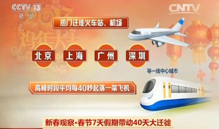 而熱門遷徙火車站、機場集中在北京、上海、廣州、深圳等一線中心城市,高峰時段平均每40秒起落一架飛機。