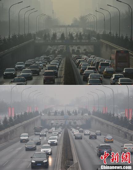 1月26日,北京三環(huán)農(nóng)展橋車輛行駛通暢(下圖),與往日的擁堵形成鮮明對比。(拼圖)中新網(wǎng)記者金碩 攝