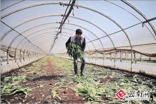 “我看到嵩明楊林一些大棚里的蔬菜被一棵棵砍倒爛在地里,聽說是因為菜價太便宜,這些菜白送人都沒人要。”昨日,市民張勇向本報反映:最近,昆明嵩明蔬菜滯銷,一些種植大戶在沒有辦法的情況下,只好砍掉蔬菜。昨日記者實地走訪發現,嵩明蔬菜滯銷的情況從去年11月就開始了,直至現在也沒有好轉跡象。這些蔬菜原本都是要銷往廣東和北方,由于外省菜價一路狂跌,這些蔬菜虧本也賣不出去。為了種上新菜,迫不得已,菜農只好忍痛將蔬菜砍掉丟棄在地里。