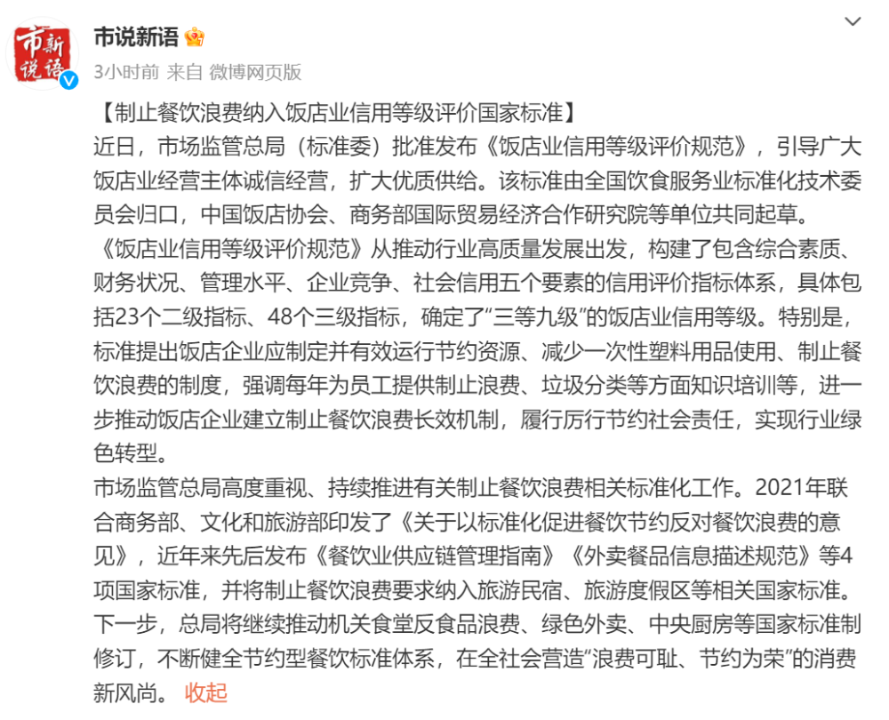 市場監管總局高度重視、持續推進有關制止餐飲浪費相關標準化工作。2021年聯合商務部、文化和旅游部印發了《關于以標準化促進餐飲節約反對餐飲浪費的意見》,近年來先后發布《餐飲業供應鏈管理指南》《外賣餐品信息描述規范》等4項國家標準,并將制止餐飲浪費要求納入旅游民宿、旅游度假區等相關國家標準。下一步,總局將繼續推動機關食堂反食品浪費、綠色外賣、中央廚房等國家標準制修訂,不斷健全節約型餐飲標準體系,在全社會營造“浪費可恥、節約為榮”的消費新風尚。
