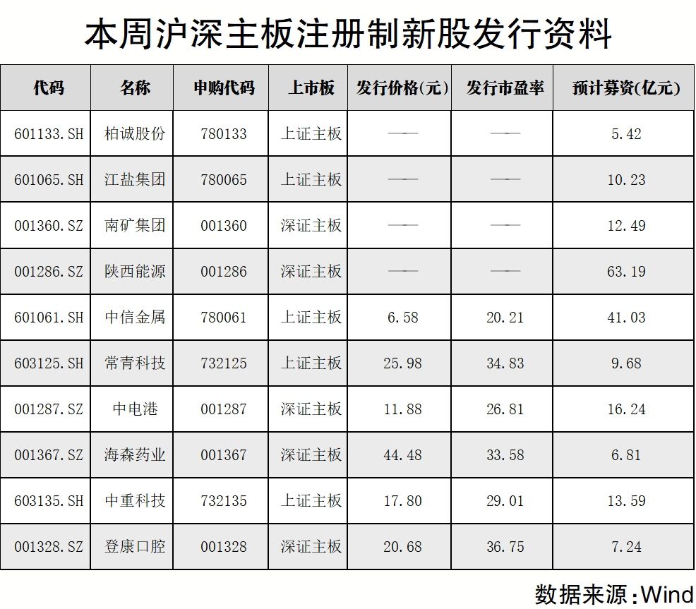 而根據Wind數據,本周滬深兩市共有10只主板注冊制新股將進行申購。其中,滬市主板5只,分別為中重科技、中信金屬、常青科技、江鹽集團和柏誠股份;深市主板5只,分別為登康口腔、中電港、海森藥業、南礦集團和陜西能源。