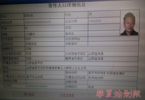 死者邸機成的戶籍信息 8月1日下午,焦家寨煤礦礦工邸機成上中班,活著走進礦井工作,第二天發現死在選煤樓下。死者邸機成,男,漢,51歲,現住原平市軒崗鎮焦家寨工人新街1844號,身份證:142202196208280958。