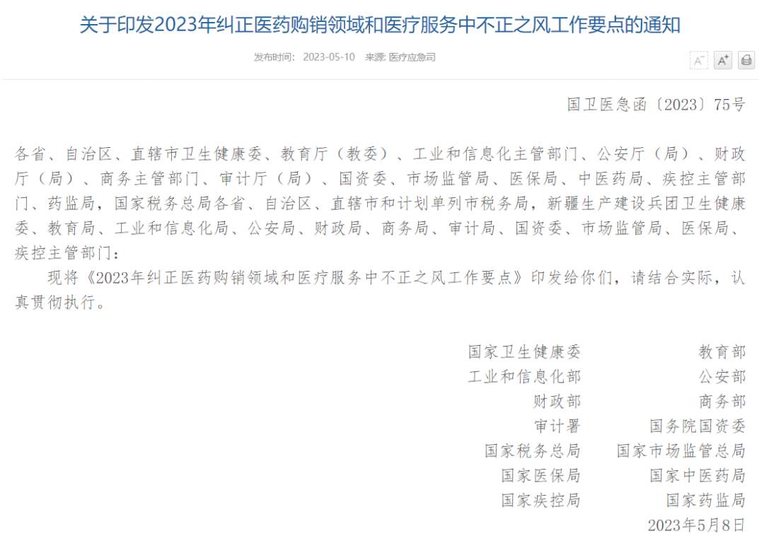 據國家衛健委網站日前消息,國家衛健委、國家醫保局等14部門印發《2023年糾正醫藥購銷領域和醫療服務中不正之風工作要點》(下稱《工作要點》)。《工作要點》從健全完善新時代糾風工作體系、整治行業重點領域的不正之風問題、強化醫保基金監督管理、深入治理醫療領域亂象、切實推進工作取得實效等五方面提出13條要求。