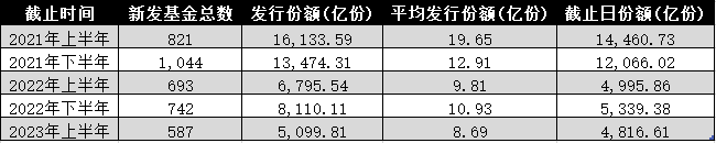 以基金成立日作為統計標準,Wind數據顯示,截至6月27日記者發稿,今年上半年合計發行基金數量為587只,相比去年同期的693只減少約15%;發行總份額為5099.81億份,相比去年同期的6795.54億份減少約25%。與去年同期相比,今年上半年基金發行份額出現明顯縮水。