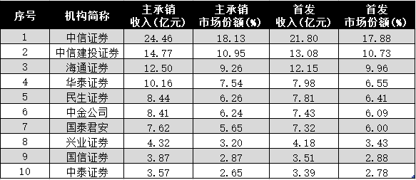 就收入水平而言,今年上半年IPO承銷收入排名前十的券商,分別為中信證券、中信建投、海通證券、華泰證券、民生證券、中金公司、國泰君安、興業(yè)證券、國信證券以及中泰證券。其中,中信證券、中信建投、海通證券分別以21.80億元、13.08億元以及12.15億元的承銷收入位居前三。