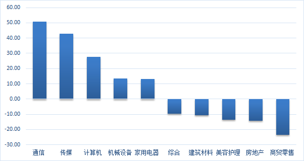 從行業(yè)情況來看,分化特點(diǎn)則表現(xiàn)更為突出。以申萬一級(jí)行業(yè)作為統(tǒng)計(jì)標(biāo)準(zhǔn),截至6月30日,31個(gè)申萬一級(jí)行業(yè)指數(shù)中,共有14個(gè)上半年收漲,占比約為半數(shù)。其中,通信、傳媒、計(jì)算機(jī)行業(yè)指數(shù)漲幅位居前三,分別為50.66%、42.75%、27.57%。此外,機(jī)械設(shè)備、家用電器和電子行業(yè)指數(shù)上半年同樣漲逾10%。而商貿(mào)零售、房地產(chǎn)、美容護(hù)理、建筑材料行業(yè)指數(shù)則跌幅居前,今年以來均跌逾10%。
