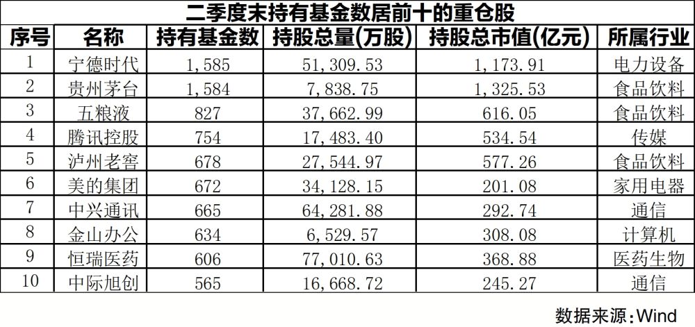 而在二季度基金重倉股中,也不乏科技股的身影。據Wind統計,二季度末持有基金數量居前的十大個股分別為寧德時代、貴州茅臺、五糧液、騰訊控股、瀘州老窖、美的集團、中興通訊、金山辦公、恒瑞醫藥以及中際旭創。其中,寧德時代、貴州茅臺均獲千只以上基金持有。持有總市值排名前十的個股則分別為:貴州茅臺、寧德時代、五糧液、瀘州老窖、騰訊控股、邁瑞醫療、恒瑞醫藥、陽光電源、金山辦公、中興通訊。