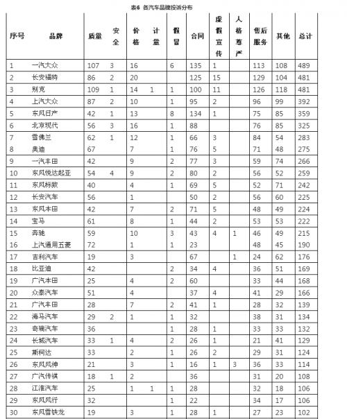 除此之外,根據全國消協組織受理的汽車投訴情況,汽車品牌中一汽大眾投訴量排在第一,合資品牌一汽豐田的投訴名次靠前,豪華車品牌奧迪也被列入前十。值得注意的是,中消協這份各汽車品牌的投訴表中,投訴量采用絕對數值,消費者應結合不同品牌汽車保有量、不同年份銷量等因素,綜合分析判斷。