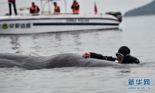 昨晚“復活“的抹香鯨在經歷了一夜的漂游后,今天早晨已經呈現出側翻的狀態,生命體征逐漸消失。目前廣東省漁政部門已趕到現場與惠州等方面進行商議善后工作。據了解,包括深圳相關機構在內的多個部門和機構都希望擁有保存這頭抹香鯨。一方面進行科研,另一方面制成標本供人參觀,科普。3月14日,在惠州港油庫碼頭附近海域,潛水員在抹香鯨身上安裝儀器對其進行聽覺測試,判斷其健康狀況。