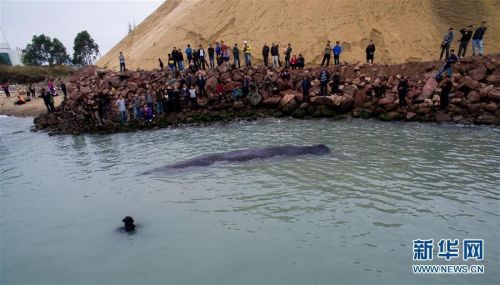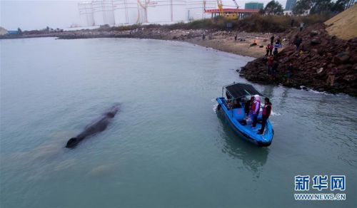 3月14日,在惠州港油庫碼頭附近海域,專家和工作人員查看游向淺灘的抹香鯨。