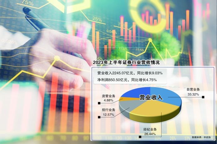 在業績方面,2023年上半年,證券行業整體經營業績較去年同期有所回升。中證協披露的經營情況顯示,2023年上半年,全行業實現營業收入2245.07億元、凈利潤850.50億元,分別同比增長9.03%、4.75%。其中,自營業務、經紀業務、投行業務、資管業務分別占營業收入的33.32%、26.44%、12.57%和4.88%。