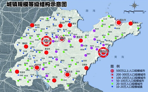 六區:以城鎮密度高、經濟聯系密切的區域為基礎,強化城鎮聯動發展,構建濟淄泰萊德聊、青濰、煙威、東濱、濟棗菏、臨日六個城鎮密集區。2020年,濟南、青島兩市城區人口達到500萬左右;淄博、棗莊、東營、煙臺、濰坊、濟寧、泰安、威海、日照、臨沂、德州、聊城、濱州、菏澤等 14市城區人口達到100~300萬,其中淄博、煙臺、濟寧、臨沂4市城區人口達到200萬以上;50~100萬人的中等城市15個;20~50萬人的小城市50個;10~20萬人的小城市35個;5~10萬人的小城鎮約50個。