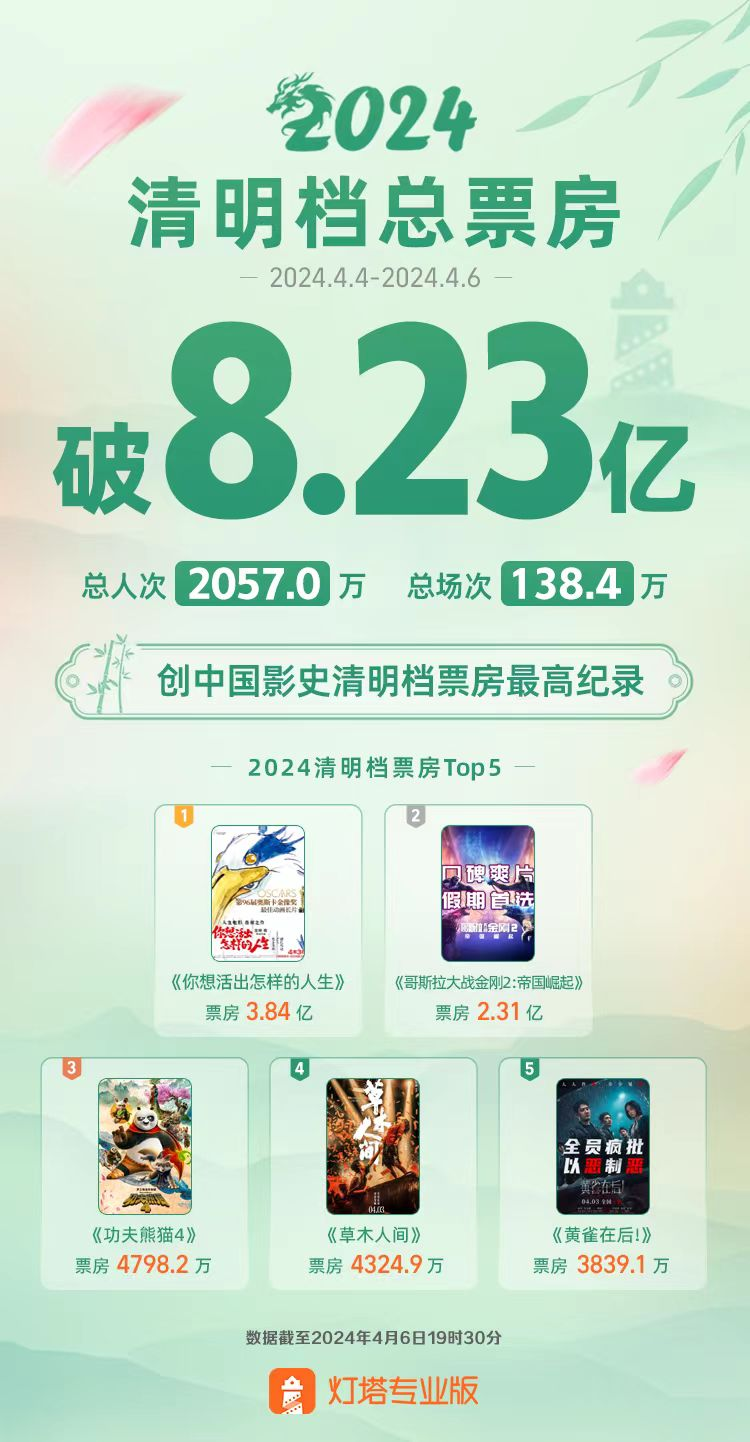 據燈塔專業版數據,截至4月6日19時30分,2024年清明檔總票房達8.23億元,打破了中國影史清明檔票房最高紀錄。業內人士表示,我國電影市場正進一步回暖,看好后續年內電影大盤市場表現。
