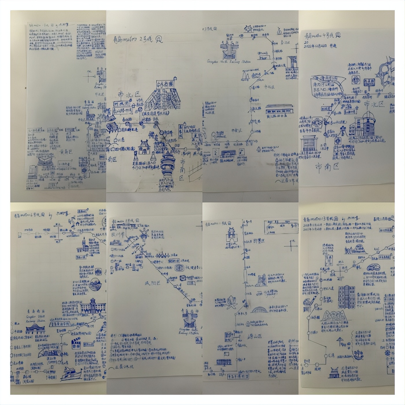 青島地鐵的每條線路他不止坐過,還畫過一遍。他用畫筆將線路周邊的機構、商業、景點串聯起來,繪制成一幅幅帶著鮮明個性色彩的地鐵出行手繪地圖。