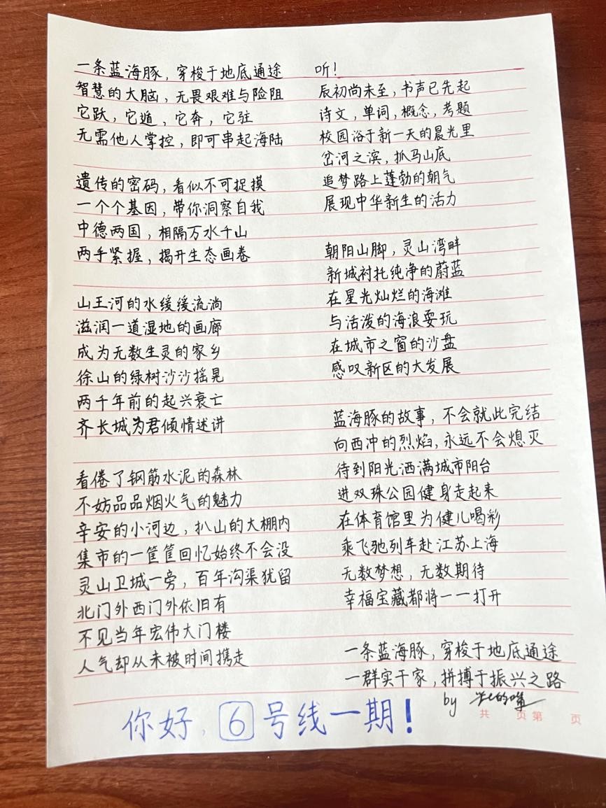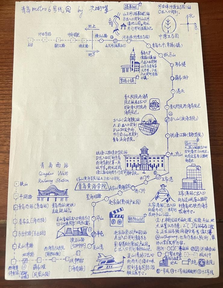 隨著6號線的開通,他所就讀的西海岸一中也接入青島地鐵出行圈,加上6號線在自主運行、智慧地鐵上的突破,讓他對6號線多了幾分偏愛。除了手繪了6號線的出行地圖,還一氣呵成了一首長詩。