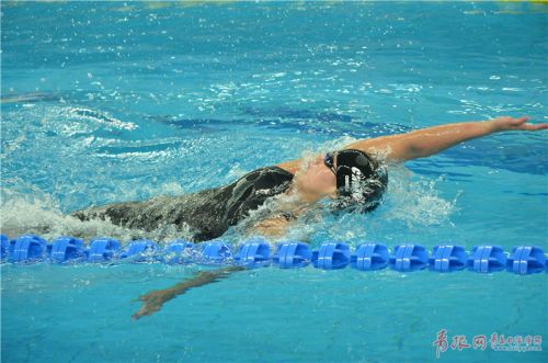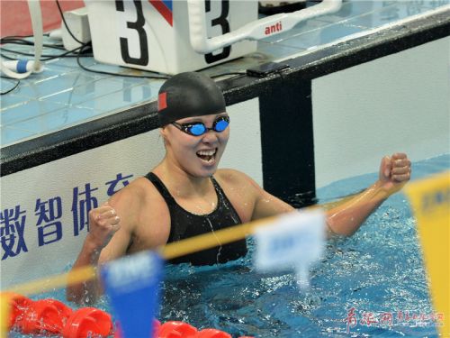 4月12日,名將傅園慧在女子100米仰泳決賽中以58.72的成績打破全國紀錄,奪得冠軍。(周光輝/攝)