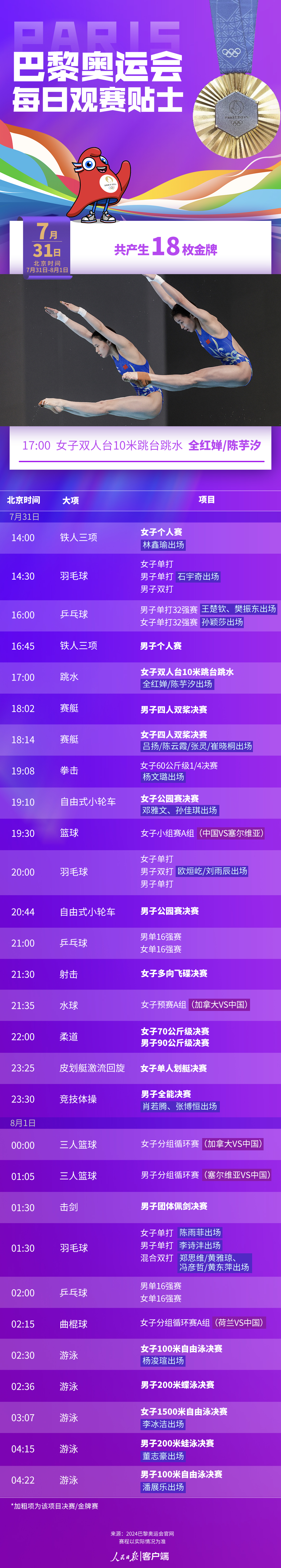巴黎時(shí)間7月31日,巴黎奧運(yùn)會(huì)將在跳水、拳擊、游泳、鐵人三項(xiàng)等項(xiàng)目產(chǎn)生18枚金牌。全紅嬋/陳芋汐跳水女子十米臺(tái)爭(zhēng)金,肖若騰、張博恒競(jìng)技體操個(gè)人全能爭(zhēng)金,潘展樂、董志豪沖擊游泳首金,這些看點(diǎn)值得關(guān)注。