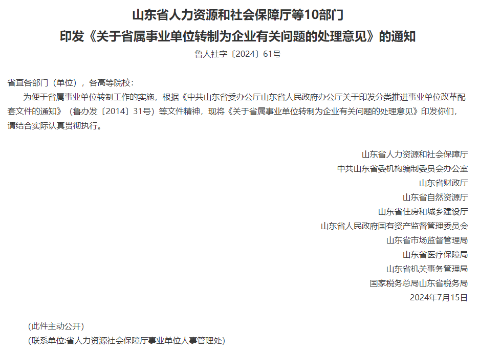 近日,山東省人力資源和社會保障廳等10部門印發《關于省屬事業單位轉制為企業有關問題的處理意見》,全文如下: