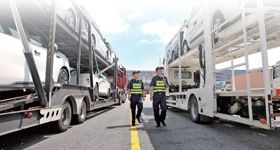 港珠澳大橋海關關員對出口汽車進行監管。俞 波攝