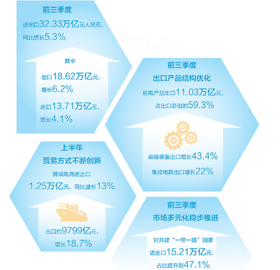 據海關統計,前三季度,我國進出口32.33萬億元人民幣,同比增長5.3%,其中,出口18.62萬億元,增長6.2%;進口13.71萬億元,增長4.1%,歷史同期首次突破32萬億元。