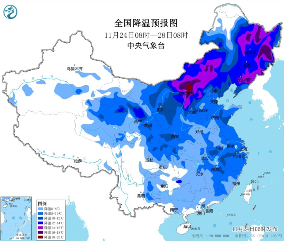 預計,11月24日08時至11月26日08時,西北地區東部、內蒙古大部、華北、遼寧、黃淮中西部、江淮西部、江漢等地大部將先后降溫6~10℃,其中,甘肅河西、青海北部、內蒙古中部、華北北部等地部分地區降溫可達12℃以上。