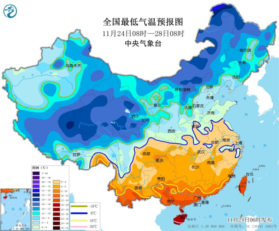 受寒潮影響,預計,11月24日08時至11月28日08時,我國大部地區氣溫將先后下降6~10℃,其中,西北地區東部、華北北部、內蒙古及東北等地部分地區降溫12~14℃,局地16℃以上。28日前后,最低氣溫0℃線將南壓至蘇皖北部至河南南部一帶,其中,大別山、黃山等高海拔山區最低氣溫也將低于0℃。
