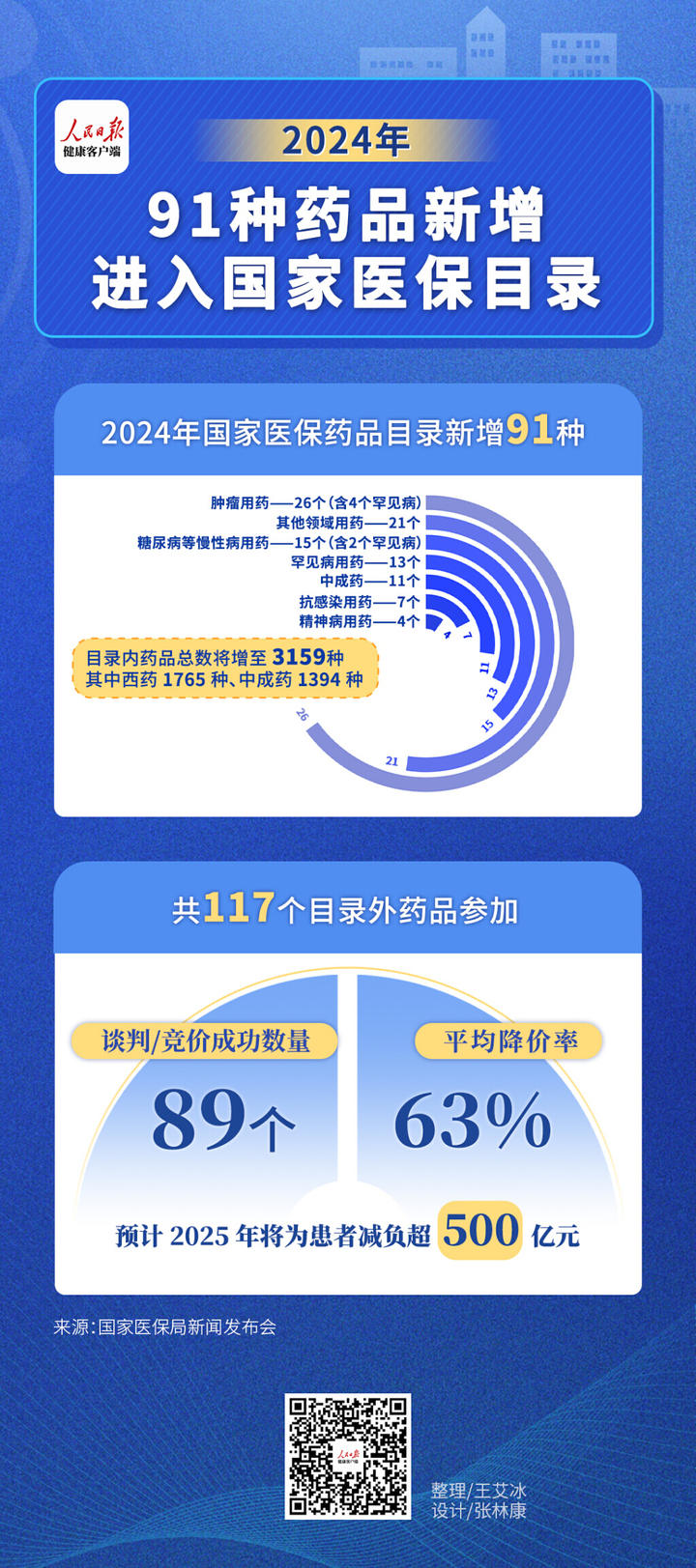 在今年的調整中,有91種藥品新增進入國家醫保藥品目錄,其中89種以談判/競價方式納入,另有2種國家集采中選藥品直接納入,同時43種臨床已被替代或長期未生產供應的藥品被調出。今年參與談判/競價的117種目錄外藥品中,89種談判或競價成功,成功率76%,平均降價63%,總體與2023年基本相當。疊加談判降價和醫保報銷因素,預計2025年將為患者減負超500億元。