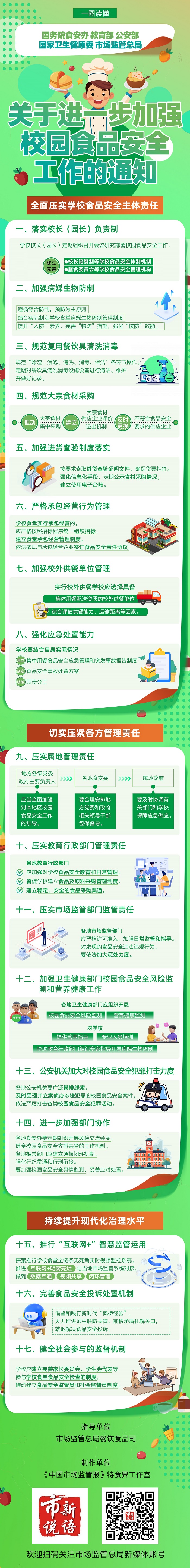 近日,國(guó)務(wù)院食安辦聯(lián)合教育部、公安部、國(guó)家衛(wèi)生健康委、市場(chǎng)監(jiān)管總局印發(fā)《關(guān)于進(jìn)一步加強(qiáng)校園食品安全工作的通知》(以下簡(jiǎn)稱《通知》),聚焦校園食品安全主體責(zé)任、管理責(zé)任和現(xiàn)代化治理水平,部署各地進(jìn)一步健全校園食品安全全鏈條防控風(fēng)險(xiǎn)的制度機(jī)制,強(qiáng)化校園食品安全保障。