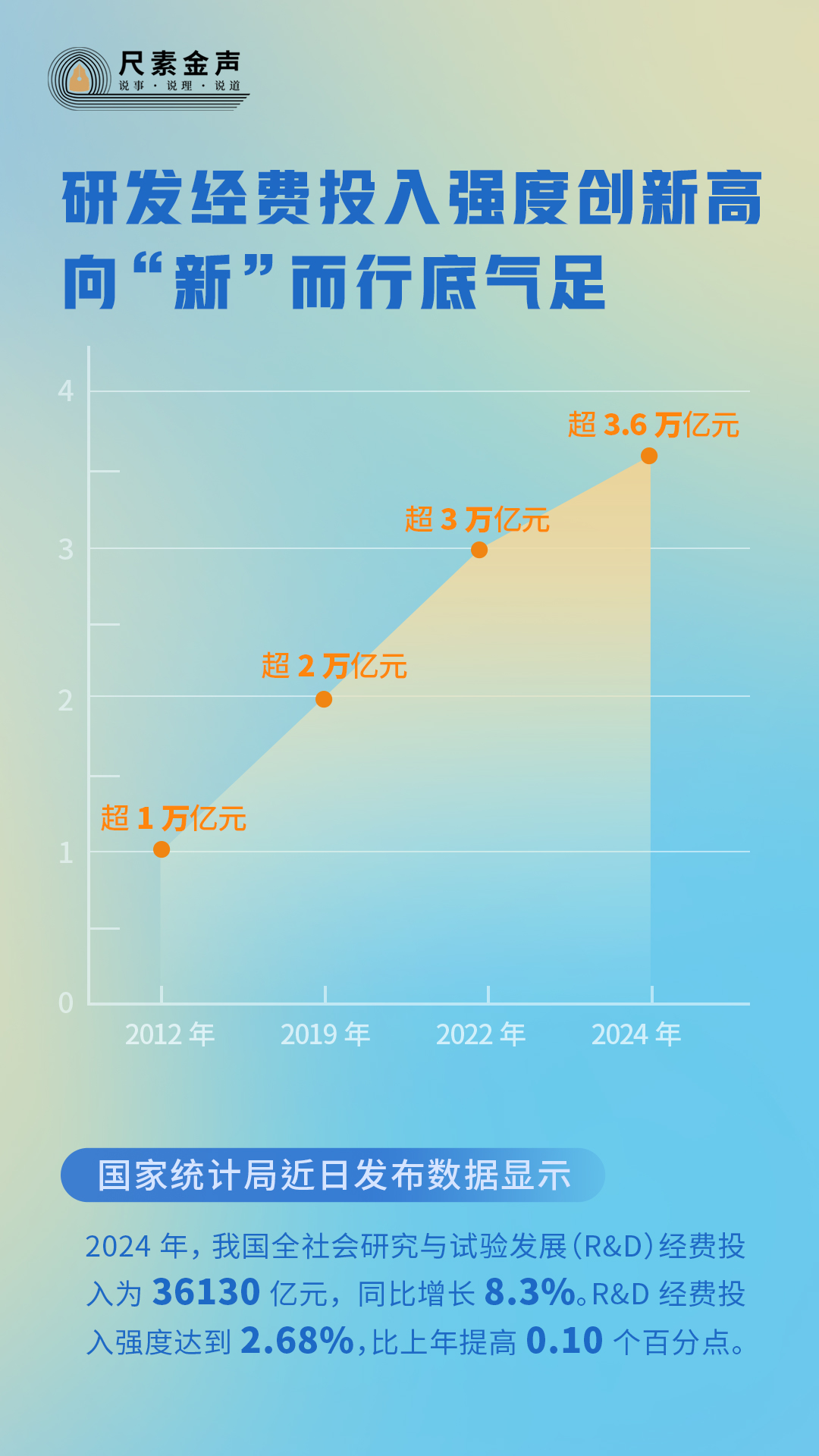 國家統(tǒng)計局近日發(fā)布數(shù)據(jù)顯示:2024年,我國全社會研究與試驗發(fā)展(R&D,以下簡稱“研發(fā)”)經(jīng)費投入為36130億元,同比增長8.3%。研發(fā)經(jīng)費投入強度達到2.68%,比上年提高0.10個百分點,再創(chuàng)新高。