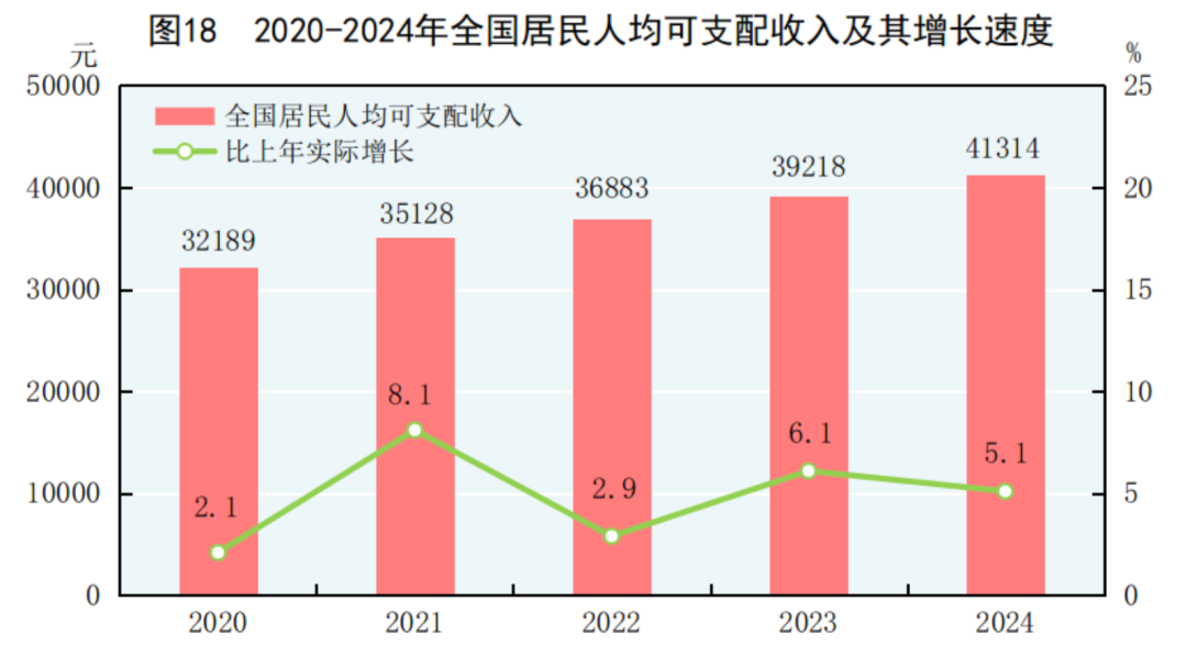 全年全國居民人均可支配收入41314元,比上年增長5.3%,扣除價格因素,實際增長5.1%。全國居民人均可支配收入中位數(shù)34707元,增長5.1%。