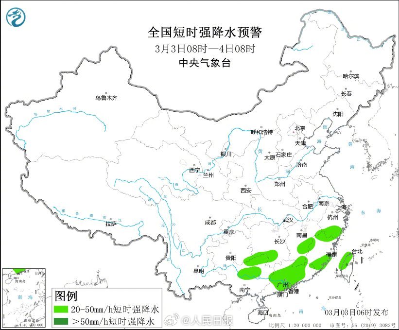 強對流天氣藍色預警:預計3月3日08時至4日08時,湖南西南部、江西東部和南部、福建西部和南部、廣西東北部、廣東中北部、臺灣島北部等地的部分地區將有8級以上雷暴大風或冰雹天氣,局地風力可達10級;