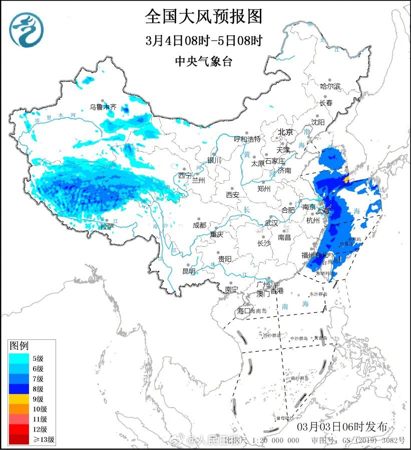 大風藍色預警:預計,3月3日08時至4日08時,新疆南疆盆地和東部、西藏中北部、青海南部等地部分地區有5~6級風、陣風7~8級;