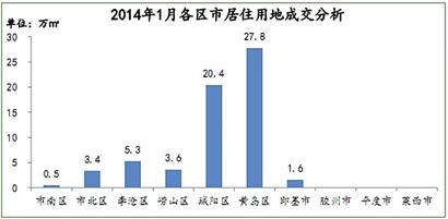 1月居住用地土地成交以黃島區成交量最高,達到27.8萬平方米,其次為城陽區,成交20.4萬平方米,此外李滄區、嶗山區、市北區、即墨市以及市南區也有部分成交。其中李滄區為5.3萬平方米,嶗山區為3.6萬平方米,市北區為3.4萬平方米,市南區僅為0.5萬平方米。