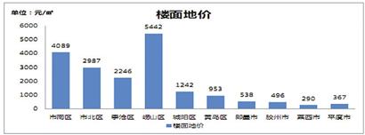 據青島高策數據分析顯示,2013年全市居住用地成交樓面均價為1031元/平方米(地面均價為1907元/平方米)。各區域成交價格中,以配套資源完善、區位交通便利和景觀資源較好的市南區、市北區和嶗山區成交價格較高,但成交量較小;在生態商住區的規劃下,李滄區的成交價格也相對較高。土地市場火爆的城陽區較去年價格有小幅提高,黃島區價格卻有小幅下降,其他市區成交價格相對平抑。